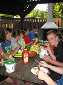 Zatímco někteří se aktivně podíleli na zvyšování své fyzické kondice, jiní se přemístili do kuchyně a začali připravovat večeři pro zbývající členy posádky výletu. První večer byla večeře zcela jednoduchá, to ostatně i všechny ostatní dny. Měli jsme kuřecí plátek s párky, s cibulí a chlebem. K tomuto jídlu jsme nakrájeli ještě čerstvou zeleninu ve formě salátové okurky a rajčete. „Děcka“, jak jsem je důvěrně po celou dobu výletu oslovoval, měla po tomto náročném dni tak velký hlad, že nezbylo vůbec nic.