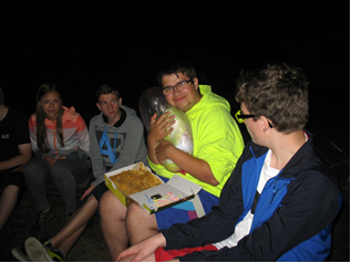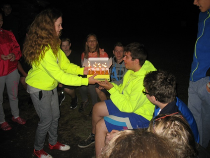 Po večeři se již začalo stmívat, tak někteří vyvolení uklidili spoušť v kuchyňce, kterou se nám povedlo vytvořit během vaření, a poté jsme se pomalu začali přesouvat k ohni. Tam jsme si všichni sedli, vytáhli zpěvníky, kytaru a spustili náš krásný zpěv. Posezení jsme si zpestřili různými hrami či vtipy. Obzvláště zajímavá byla ale hra, která vypadala ze začátku úplně normálně. Hra spočívala v tom, že si dotyčný vybraný, v tomto případě Jirka Plaček, měl zapamatovat, kdo kde sedí. Pak se mu zavázaly oči. Během okamžiku, kdy měl zavázané oči, jsme si měli vyměnit místa. Jirka po odkrytí očí šátkem skvěle vyjmenoval všechny změny. Až jsem se tomu divil. ☺ Jenže pak přišla řada na mě. Měl jsem to mít těžší v tom, že si měli lidé měnit i oblečení. Jenže když jsem měl zavázané oči já, nebylo to jen o přesunu míst. Přistoupily ke mně tři osoby otočené pozadím. Měl jsem zjistit, které pozadí je čí. Bohužel jsem neuhodl ani jedno, ale za to jsem zjistil, že některé holky mají pozadí v klučičích tvarech a zase naopak – kluci v holčičích tvarech. Co následovalo poté, mě dostalo. Sundali mi šátek. Přede mnou dort a na něm 16 svíček… V ten den jsem totiž měl své 16. narozeniny.