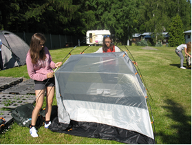 Po zhruba šesti a půl hodinové cestě jsme dorazili do kempu. Ujeli jsme krásných 60 kilometrů. V kempu už na nás čekala Natalí Nytrová s věcmi, které nám tam přivezl její strejda, abychom je nemuseli tahat na zádech. Při příjezdu jsme všichni doslova odhodili kola a šli jsme se se svými věcmi ubytovat na chatky. Tam někteří zalehli do postelí hned po otevření dveří, jiní naopak i po příjezdu vytáhli míče, pálky a šli hrát fotbal, badminton, či tenis. Zkrátka a dobře, první den ze sebe vydal každý maximum energie. Někteří překvapili i sami sebe.